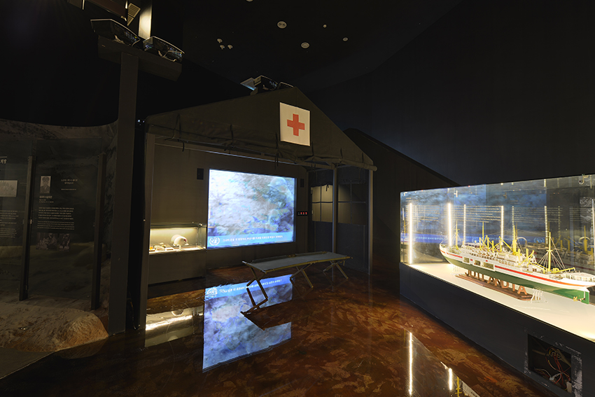 UN결의안에 따라 군인과 군수물자들이 도착하는 부산항의 모습과 당시 피란민들이 도착했던 부산역 그리고 영주동에 형성되었던 피란촌을 재현한 공간이다.