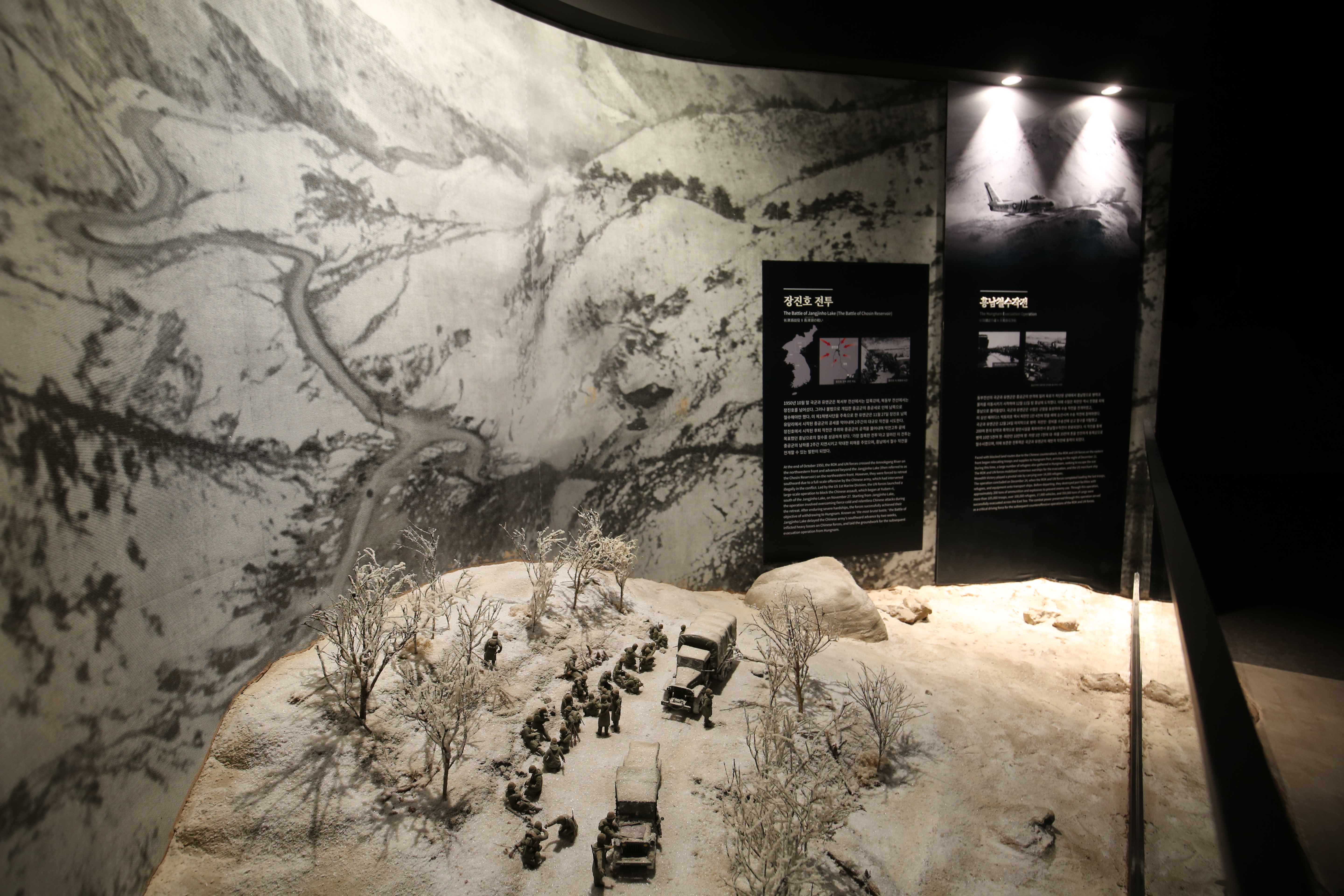 3 years and 1 month, 1,129 days: the period of the War The Korean War Room focuses on the relationship between the UN and Korea during the Korean War that we know well. UN forces, taking the first step in a strange land and entering Busan harbor to come to the aid of Korea; the Battle of Chosin Reservoir, where forces had to fight not just against the enemy but also a bitterly cold winter; the Hungnam Evacuation; the Miracle of Christmas; the Mission of Stroller transport for rescuing war orphans, and so on -- We must always remember these old histories made possible by sacrifice and devotion.